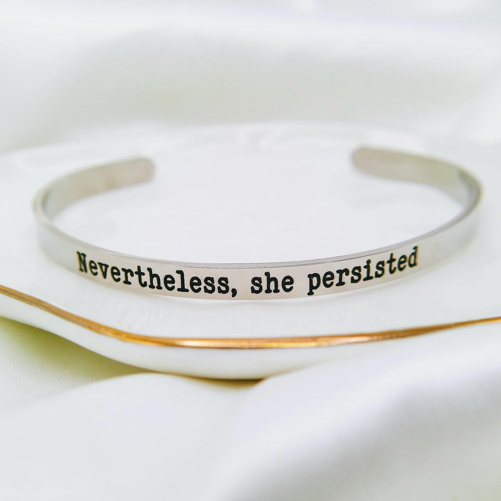 Celebrate strength, perseverance, and resilience with our Nevertheless, She Persisted Cuff Bracelet — a powerful reminder to keep going no matter what. This engraved 14k gold bracelet makes a beautiful and meaningful gift for yourself or someone who inspires you with their courage and determination.